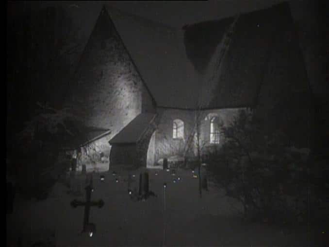 Värmdö medeltida kyrka i nattlig belysning. Klockaren ...