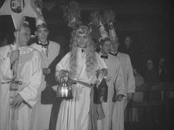 I vårt urval finns även andra sidan av myntet representerat i form av en reklamfilm för Epa Stormarknad från 1969 som säljer julefrid och en tecknad reklamfilm från Matador som låter alla barn förstå att det är rakblad från Matador som är varje fars drömjulklapp. I Einar Dahlins privata samlingar från 1962 kan vi se familjens och andra Stockholmares julfirande med bilder från bland annat varuhuset PUB:s julskyltning och andra gatumiljöer i traditionsenlig ljusskrud. Våra journalfilmer från 1940- och 1950-talet presenterar en rad Lucia-kandidater, ackompanjerade av jazziga muzakversioner av Sankta Lucia, från den tid då uttagningen också var en skönhetstävling. Inom ramen för dessa filmer finns även en skälmsk, för att låna speakerns ordval, Lucia i drag från Pressfotografernas klubbs firande på Skansen 1945. Märk väl den roade församlingens välondulerade huvuden.